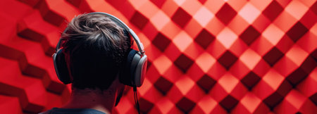 Stylish image of a man with headphones listening against bold geometric noise background ideal for audio concepts.