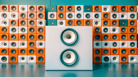 A white speaker with two speakers in front of a wall of smaller speakers in orange and white.