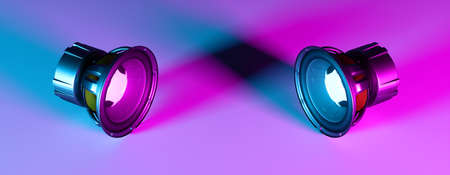 Sound audio speaker with neon lights on dark background. Dynamic monitor closeup. Creative backgroound