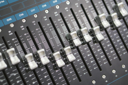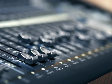 Professional Audio dj mixer console, sound tools and gear, studio equipment picture, selective focus picture of faders and knobs of mixer