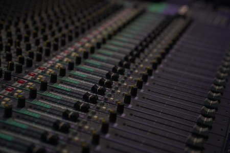The audio equipment, control panel of analog studio mixer, front view. Close-up, selected focus