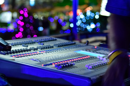 studio working with sound and light mixer console for the sound engineer working on recording studio mixer adjusting the volume of a sound mixer audio mixing console with mixer board,selective focus