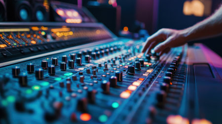Modern mixing desk with glowing buttons and screens in a vibrant audio setup
