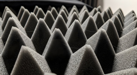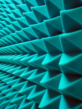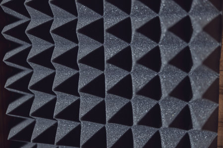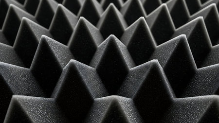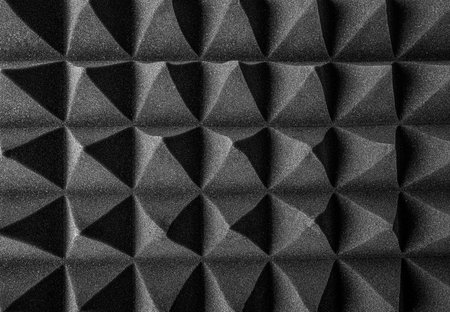 A close-up of acoustic foam panels with a pyramid pattern, used for soundproofing and absorption. The geometric shapes create a textured, abstract background, representing sound engineering, recording studios, and noise cancellation.
