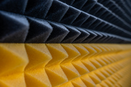 Close-up of black and yellow acoustic foam panels, soundproofing material