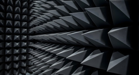 The geometric, textured interior of a professional anechoic chamber, with walls covered in pyramid-shaped acoustic foam panels. This sound-absorbent environment is designed for acoustic research, creating a space of complete silence.