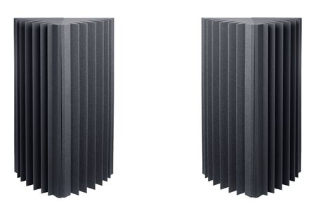 A close-up, angled view of dark grey acoustic foam panels featuring a geometric pyramid pattern. This type of foam is used for sound absorption and diffusion in recording studios, home theaters, and other audio environments to reduce echo and reverberation.