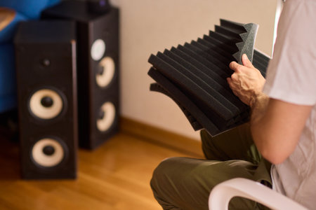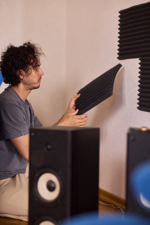 Setting up audio equipment with soundproofing panels in a modern studio environment