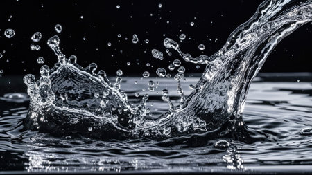A dramatic close-up of a water splash in motion, with crystal-clear details and light reflections creating a dynamic, refreshing scene.