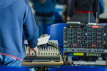 Sound engineer working with audio mixing console at a live event. Selective focus.
