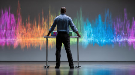 Businessman standing at his desk with two open laptops, analyzing colorful soundwave frequencies projected on a large wall in a dark room. Generative ai