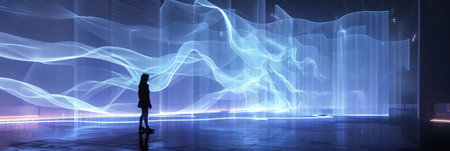 A person stands in the foreground, facing a massive light projection that illuminates the scene. The individual is bathed in the colorful glow, creating a striking visual contrast against the dark surroundings. The light projection dominates the background, casting intricate patterns and shapes.