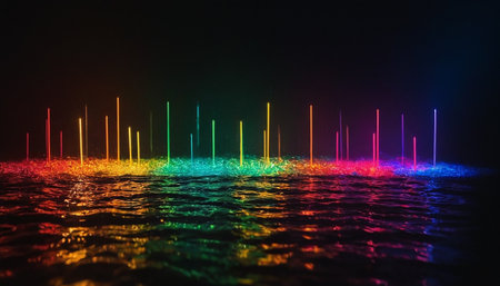 A dynamic wave of colorful energy pulses across a dark, reflective surface, visualizing the flow of digital information, sound frequency, or quantum particles.