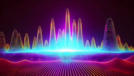 Abstract neon sound wave landscape with glowing particles and a reflective surface in vibrant colors.