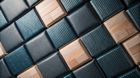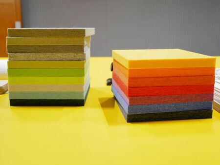 A vibrant arrangement of felt blocks and wooden pieces creates a visually appealing background, perfect for design projects, crafts, or art inspiration.