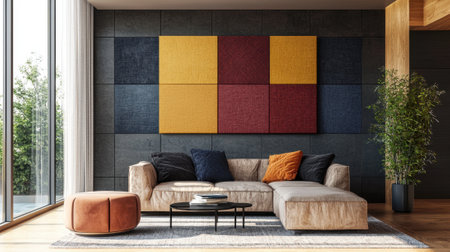 Modern living room interior with colorful wall panels, a couch, an armchair, a coffee table, and a rug.