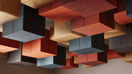 This striking image features a modern interior with colorful cubes artistically suspended from the ceiling, creating a vibrant and dynamic atmosphere.