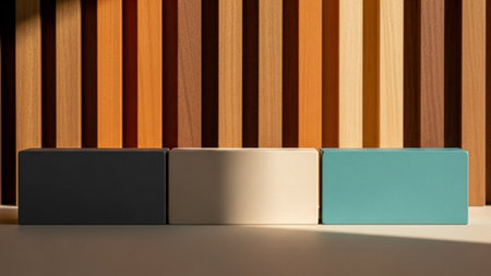Four rectangular blocks in black, grey, white, and teal arranged horizontally on a light wooden surface with vertical wooden slats in the background casting soft shadows