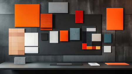 A creative office desk setup with a mood board, color swatches, and a laptop.