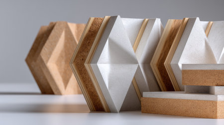 This image presents an abstract arrangement of geometric shapes featuring organic textures and neutral tones, ideal for modern design inspirations and architectural projects.