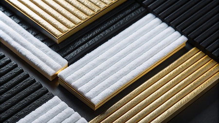 A close-up shot of a set of white towels, golden and black striped tiles on a gray background.