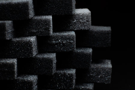 Close-up of black and yellow acoustic foam panels, soundproofing material
