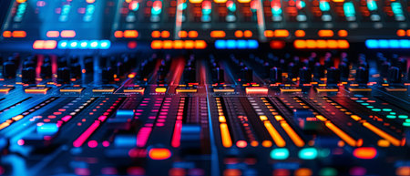 Sound board with vivid lights in the background, ideal for music events and designs with a concert theme.