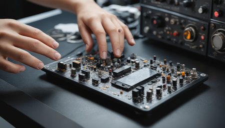 This close-up image depicts an electronic circuit board with various capacitors and resistors, showcasing intricate details of modern technology and engineering design.
