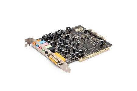 Used internal video capture card for converting analog video signal and sound card PCI bus on a white background