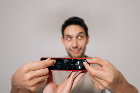 Cheerful musician using usb audio interface card, adjusting controls on recording equipment for sound engineering, creating digital music with home studio gear, focusing on audio production setup.