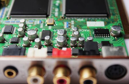 A part of Internal analog sound card. Computer equipment. Close-up, selective focus