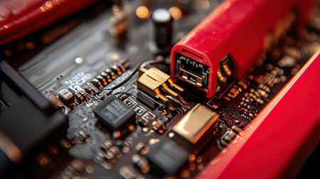This macro shot showcases a detailed circuit board featuring various electronic components and vibrant connectors, highlighting innovation and technology.