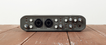 professional computer device external sound card for playback and recording, mixer, audio inputs and audio outputs, selective focus