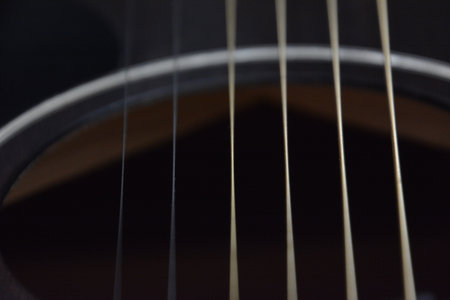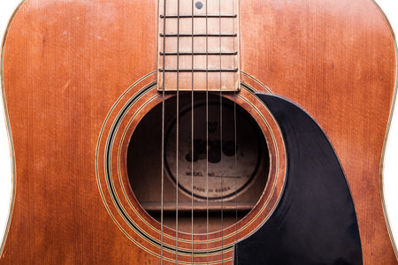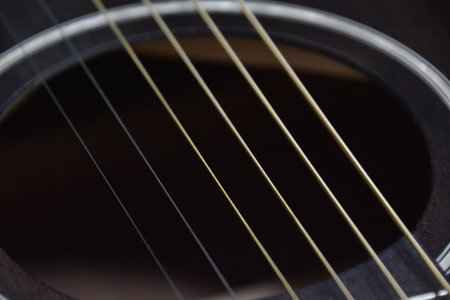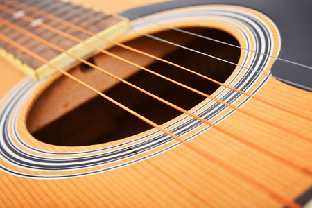 Details of classic acoustic guitar, strings and chords, guitar neck close up