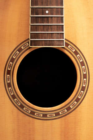 old wood guitar without strings made of light wood with brown patterns and a black hole