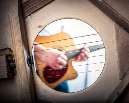 Hand Of Man Playing Acoustic Guitar Viewed From Inside Hole
