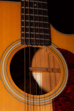 Acoustic guitar close up. musical instrument. strings on the guitar fretboard