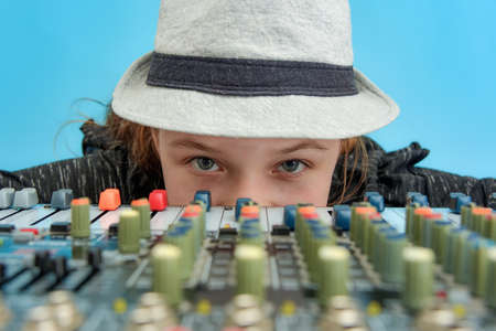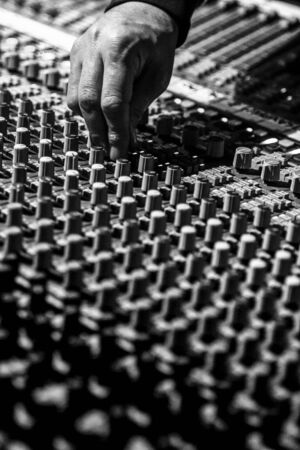 Old-fashioned sound mixer in studio closeup. Music background. Album recording process, unrecognizable musician, electronic instruments concept