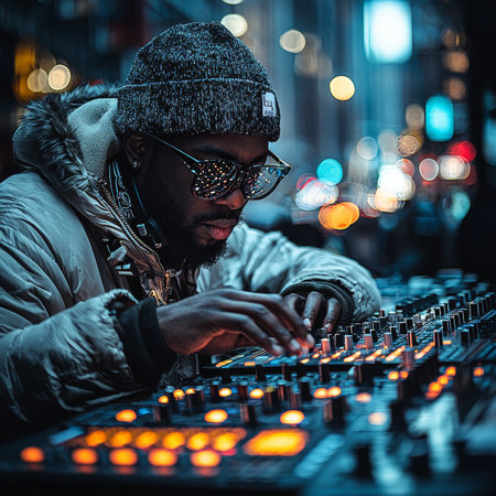 A DJ performing in an urban setting, skillfully operating mixing equipment under city lights with glowing bokeh effects emphasizing the artistic and energetic city nightlife atmosphere.
