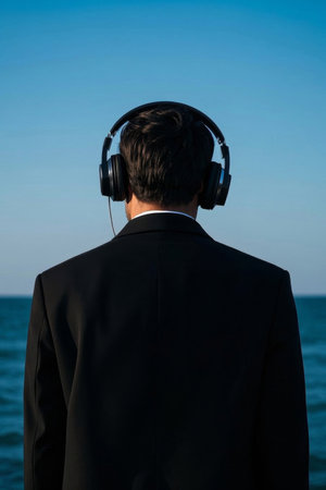 Man in black listening to music with headphones at the beach