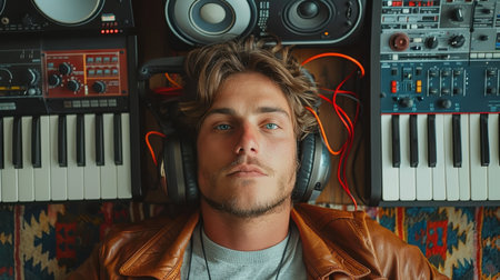 Music producer is standing in his recording studio, surrounded by instruments and recording equipment