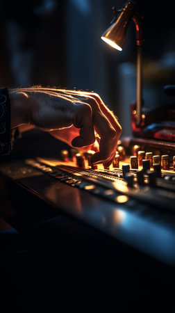 An audio mixer with its knobs and sliders meticulously adjusted, embodying precision and control in the art of sound engineering and music production