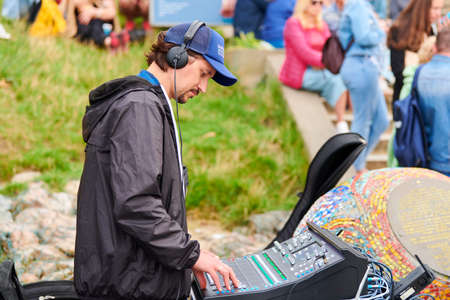 Svetlogorsk, Russia - 08.14.2021 - Sound engineer working on sound mixer at live concert, sliders and buttons on audio mixing console desk. Professional stage sound mixer using audio mix slider