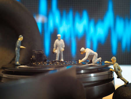 Miniature people : Close up engineer checks the sound quality of the headphone