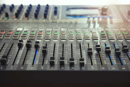 Professional Audio dj mixer console, sound tools and gear, studio equipment picture, selective focus picture of faders and knobs of mixer