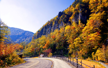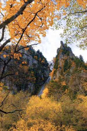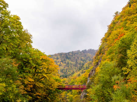 The colorful autumn scenery of forests and mountain streams in Japan. Japan, Aomori, Hakkoda, Jogakura Stream