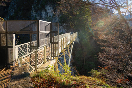 Japan. Kofu. Road for tourists in the gorge. Road at the foot of the mountain. Nature of the city of Kofu. Tourist path the park. Road along the cliff is fenced. Autumn landscape of Japanese forest