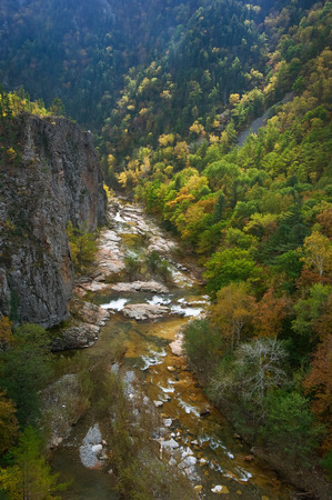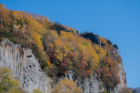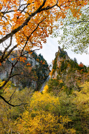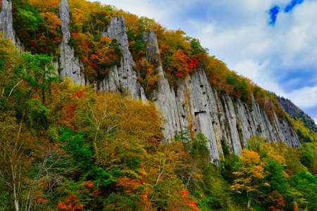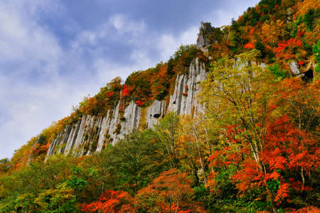 Natural stream flow passing the rock cliff with the beautiful colorful foliage of autumn season at Naruko Gorge, Miyagi Prefecture, Japan.