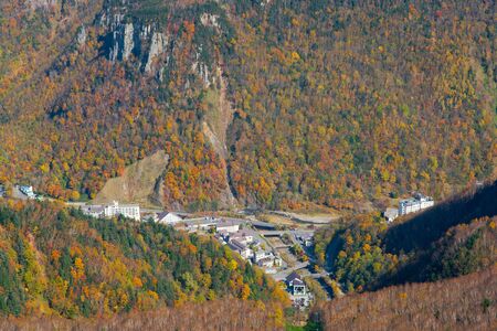 Kofu. Japan Autumn canyon. Colorful trees near the Shosenkyo Gorge. Japanese forest. Autumn landscape of the city of kofu. Panorama of Japanese nature. landscapes of east asia. Autumn Canyon Nature