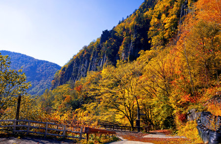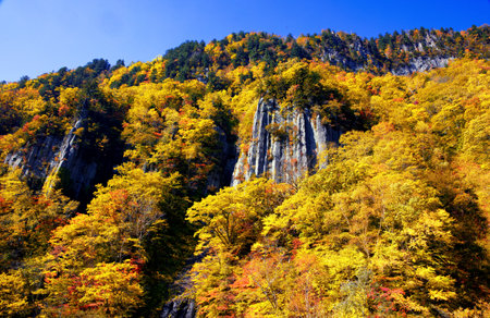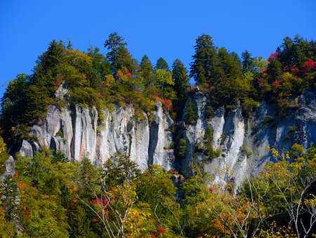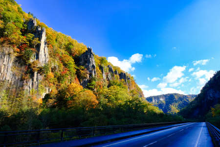 Geibi Gorge (Geibikei) Autumn foliage scenery view in sunny day. Beautiful landscapes of magnificent fall colors in Ichinoseki, Iwate Prefecture, Japan